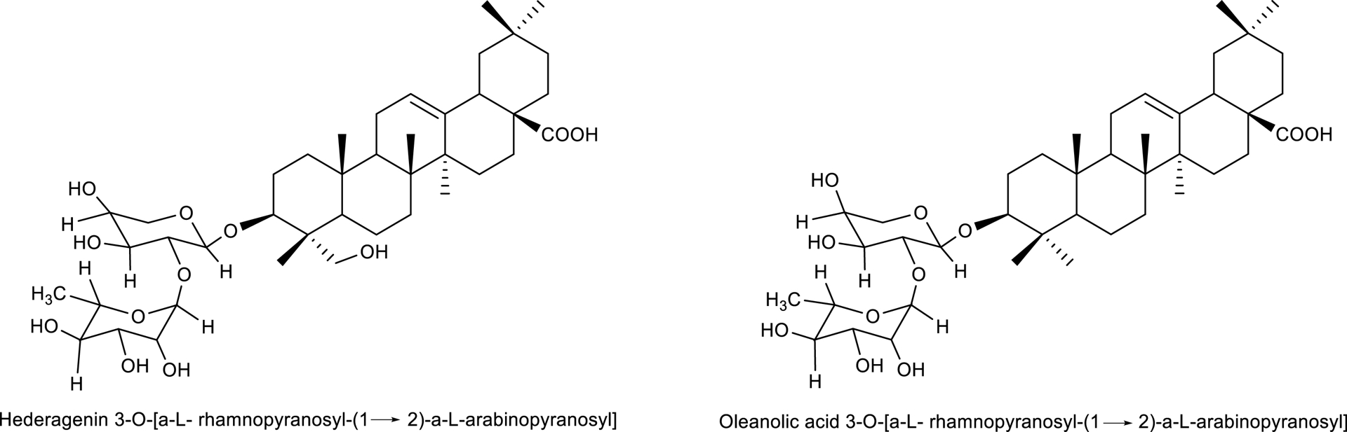 Hederagenin 3-O-[α-L-rhamnopyranosyl-(1→2)-α-L-arabinopyranosyl] (Pulsatilla A) (S5): typical hydrogen signals from glycidic units such as arabinose were observed at δH 5.13 (d, J 6.3 Hz) (anomeric hydrogen H-1′) and from raminose at δH 6.23 (sl) (anomeric hydrogen H-1′′), in addition to signals characteristic of anomeric carbons for two sugar units of the arabinose type at δC 104.4 and raminose at δC 101.7, and an oxymethylene carbon signal at δC 64.0 (Tables 4 and 5; Section S5, Figures S5A–S5C, Supplementary Material).