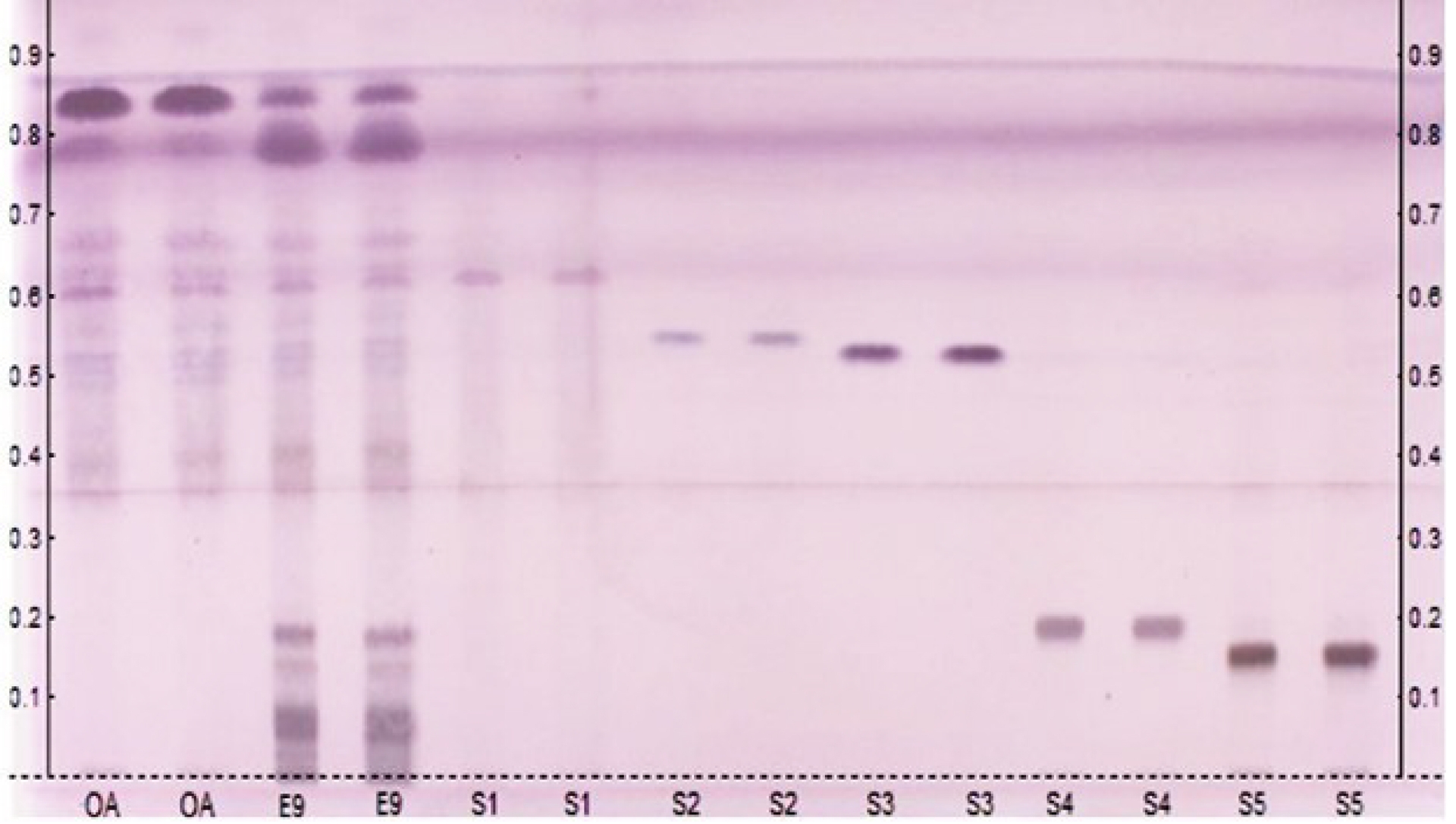 Fingerprint—andiroba oil (OA), hot ethanolic extract (E9) and isolated substances (S1, S2, S3, S4 and S5) in duplicate via HPTLC. Elution system, gradient mode: Hexane/AcOEt/MeOH (1% HCOOH). VSA derivatizer.