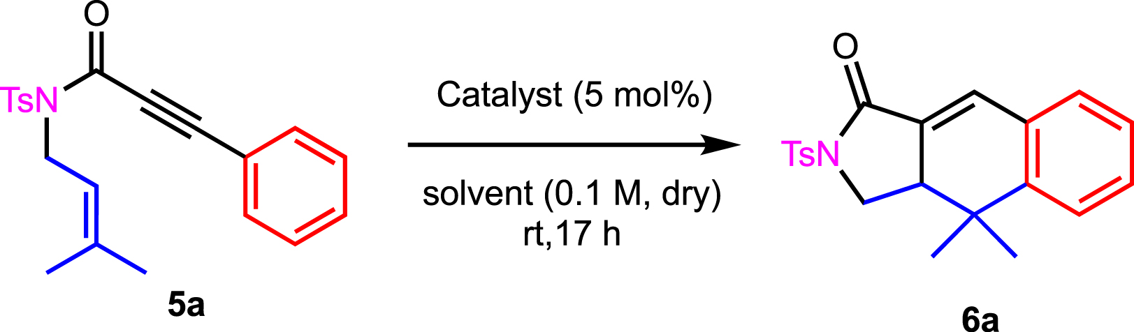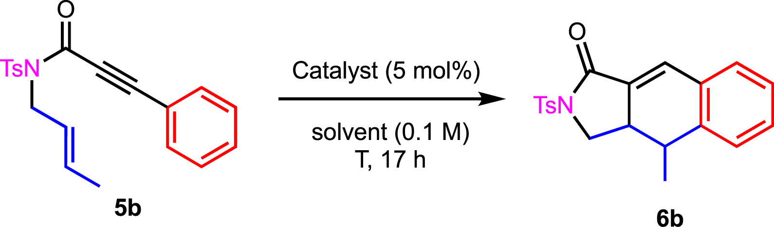 In order to obtain 6b, we initiated this study by investigating the reaction in the presence of gold or platinum complex in dichloromethane at room temperature (Table 2, entries 1–3). Low to no conversions were observed. Switching to other solvents such as nitromethane, dichloroethane, or toluene did not give better results (Table 2, entries 4–6).