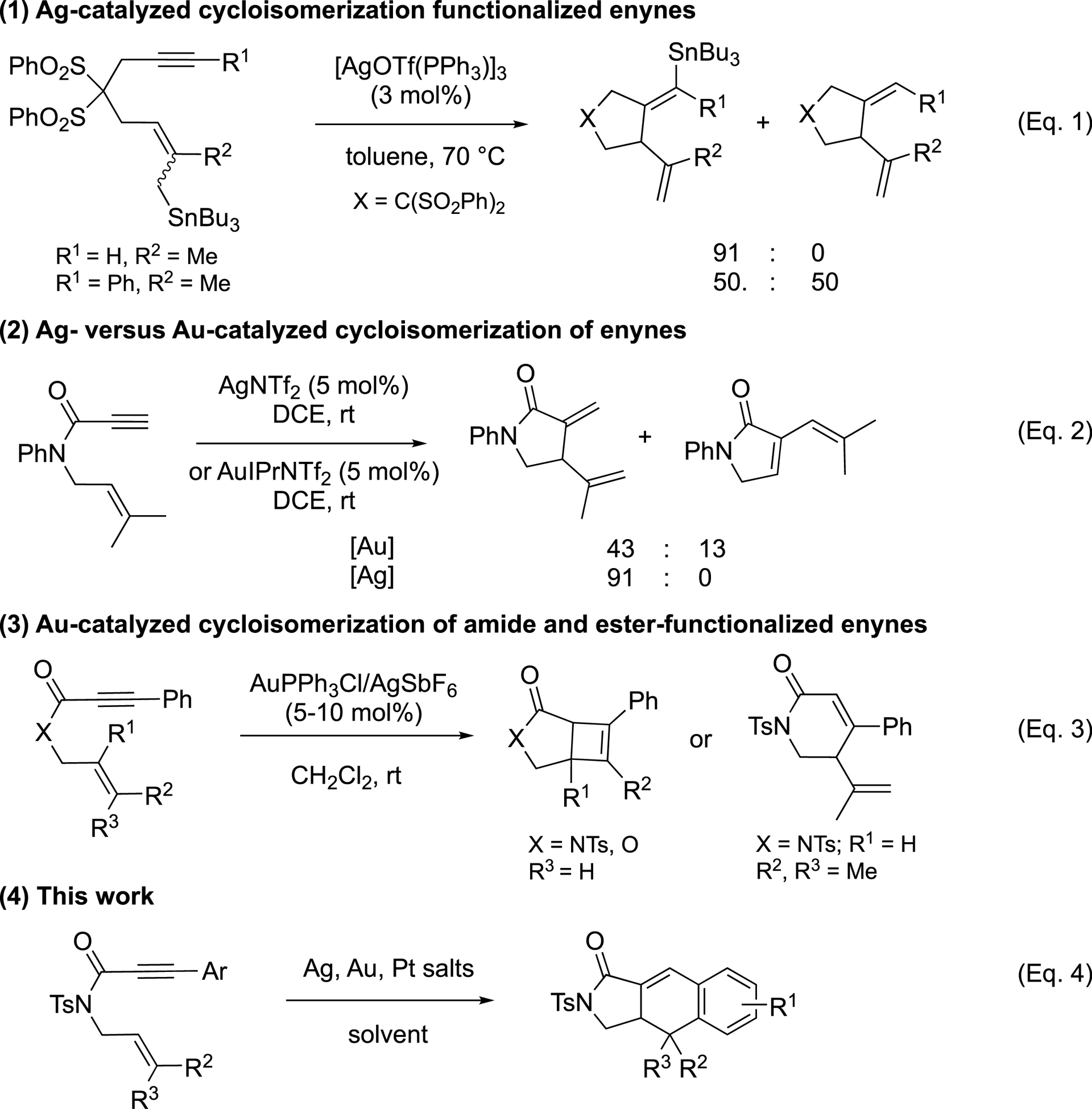 Silver made its first appearance around 5000 BC, recognized as a soft, malleable, ductile, shiny white precious metal. Owing to its outer orbital 5s1 electronic structure, silver is able to form a variety of silver(I) salts/complexes with diverse counterions, such as oxides, sulfides, phosphides, olefin complexes, and others. The typical d10 electronic configuration enables silver to coordinate with many π-donors, including N-, O-, and S-donor groups like alkynes, alkenes, and various unsaturated bonds containing carbon and heteroatoms [1, 2, 3, 4, 5]. Furthermore, because of the vacant f orbitals and relativistic contraction, Ag demonstrates σ- or π-Lewisacidity with a tendency for σ-coordination over π-coordination [6, 7]. The first documented instance of a silver-catalyzed reaction, converting ethylene into ethylene oxide, was noted in the 1930s [8]. Historically, silver was perceived to have lower catalytic activity and efficiency compared to other transition metals. However, in recent decades, the exploration of silver-based catalysts has progressed swiftly under both heterogeneous and homogeneous conditions [9, 10, 11, 12, 13, 14, 15]. Regarding 1,6-enynes, the literature contains a limited number of cases of silver-catalyzed cyclizations. Porcel and Echavarren reported in 2007 the first silver-catalyzed intramolecular carbostannylation of 1,6-enynes utilizing [AgOTf(PPh3)]3 as a catalyst [15] (Scheme 1, Equation (1)). In 2013, Shin’s group disclosed silver-catalyzed cycloisomerization reactions of propiolamide derived 1,6-enynes in the case of N-arylamides [16] (Scheme 1, Equation (2)). For this kind of substrate, the carbonyl group was demonstrated to be a key group for the silver-catalyzed 5-exo-dig selective cyclization. The employment of Au(IPr)NTf2 led to lower selectivity, with 1,4-diene accompanied by 1,3-diene. A 6-endo-dig cyclization of 1,6-enyne systems was proposed in the presence of a gold(I) cationic system [17, 18]. Moreover, theoretical calculations showed the importance of both the aryl group in the terminal position of the alkyne and the carbonyl group (Scheme 1, Equation (3)). Following our endeavor towards organometallic catalysis and more specifically silver- and gold-catalyzed cyclization [19, 20, 21, 22, 23, 24], we became interested in using propiolamide as the linker for enyne derivatives. We and other authors recently described preliminary results on intramolecular [4+2]-cycloaddition of N-(3-methylbut-2-en-1-yl)-amide-1,6-enyne in the presence of Ag catalyst [16, 23, 24]. We report herein our full study including the complementary activity of silver, gold, and platinum complexes (Scheme 1, Equation (4)).