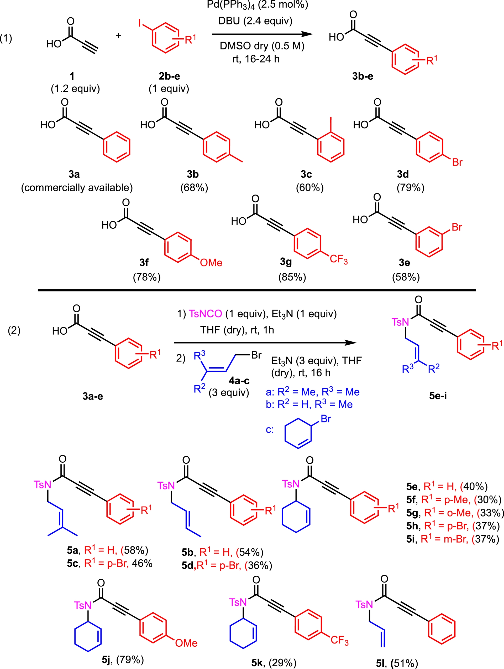 The syntheses of the starting enyne derivatives 5a–5l were accomplished through a three-step reaction sequence (Scheme 2). The strategy to prepare N-tosylpropiolamides was realized starting from the aryl alkynyl carboxylic acids 3a–3e, which were either commercially available (3a) or obtained by Sonogashira cross-coupling from propiolic acids 3b–3e and aryl iodides (Scheme 2). Different aryl alkynyl carboxylic acids were prepared via a copper-free Sonogashira coupling from propiolic acid and aryl halides. This method implied the use of 1,8-diazabicyclo[5.4.0]undec-7-ene/DBU (2.4 equiv) and Pd(PPh3)4 (2.5 mol%) in DMSO. As shown in Scheme 2, the aryl alkynyl carboxylic acids 3b–3e bearing electron-donating groups such as ortho-methyl, para-methyl, and para-methoxy and electron-withdrawing groups such as para-bromo, meta-bromo, and para-CF3, on the phenyl ring, were efficiently obtained in 58% to 85% yields. The next step was the condensation of commercially available 4-methylbenzenesulfonyl isocyanate and various bromo-alkenes. This one-pot process was performed on the prepared carboxylic acids 3b–3e by treatment with allylic bromides, and several functionalized enynes were isolated (5a–5l) in modest to good yields (29–79%).