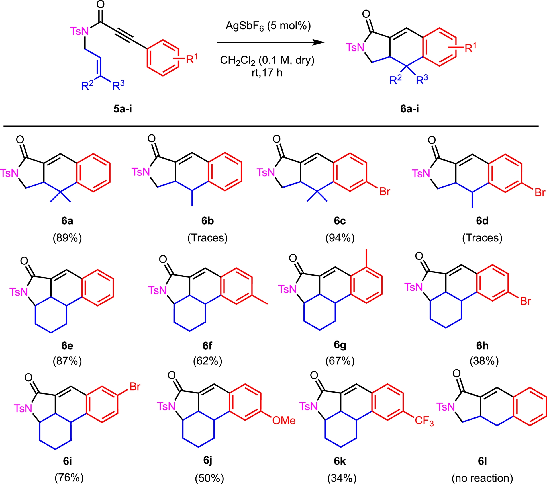 Interestingly, the disubstitution of the alkene moiety was crucial to the cyclization. Traces of 6b and 6d were detected whereas no reaction was observed in the case of 6l. We therefore turned our attention to substrates 5b, 5d, and 5l to further revisit their potential reactivity (Table 2, Scheme 4).