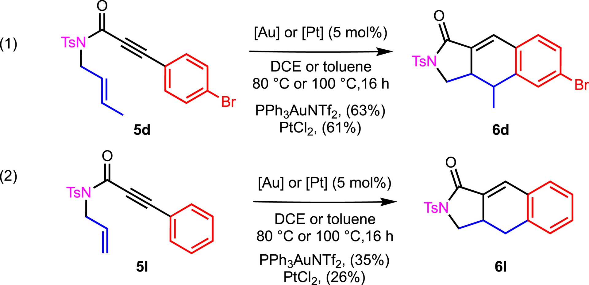 Under these conditions, the cyclization of 5d and 5l was attempted (Scheme 4). The bromo derivative 6d was isolated in similar yields of 63% and 61% by using gold and platinum, respectively. The case of 5l was still tricky, as non-substituted adduct 6l was obtained only in the case of PtCl2, with a very modest yield of 26%. The yield was slightly increased to 35% in the presence of PPh3AuNTf2, which is a preliminary promising result.