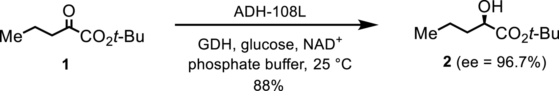 Most examples utilize a second enzyme for NAD(P)H cofactor recycling. Others employ a single enzyme for both ketone reduction and cosubstrate oxidation of propan-2-ol to acetone [3]. Generally, KREDs exhibit broad substrate specificity, although the reduction of ketones with bulky substituents is lacking. For instance, an intermediate for an investigational γ-secretase inhibitor for Alzheimer’s Disease treatment (Scheme 1), 1,1-dimethylethyl (R)-2-hydroxypentanoate 2, was synthesized via enzymatic reduction of a ketoester [4]. The reaction, conducted with 35 kg of ketoester in phosphate buffer and glycerol, utilized low enzyme loadings of ADH-108L and glucose dehydrogenase (GDH), with efficient NAD+ recycling by GDH and glucose.
