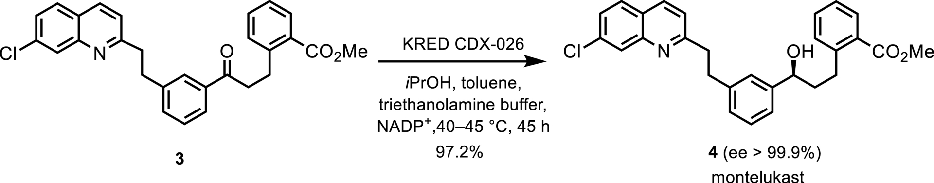 Another example employed an engineered KRED, CDX-026, in the synthesis of an intermediate for montelukast, the active ingredient in Singulair® from Merck (Scheme 2) [1]. The reaction, performed on 230 kg of ketone 3 in a mixture of propan-2-ol, toluene, and triethanolamine buffer, achieved a 97% yield. Crystallization of the alcohol as monohydrate drove the reaction to high conversion without acetone removal, with CDX-026 recycling NADP+ by oxidizing propan-2-ol.