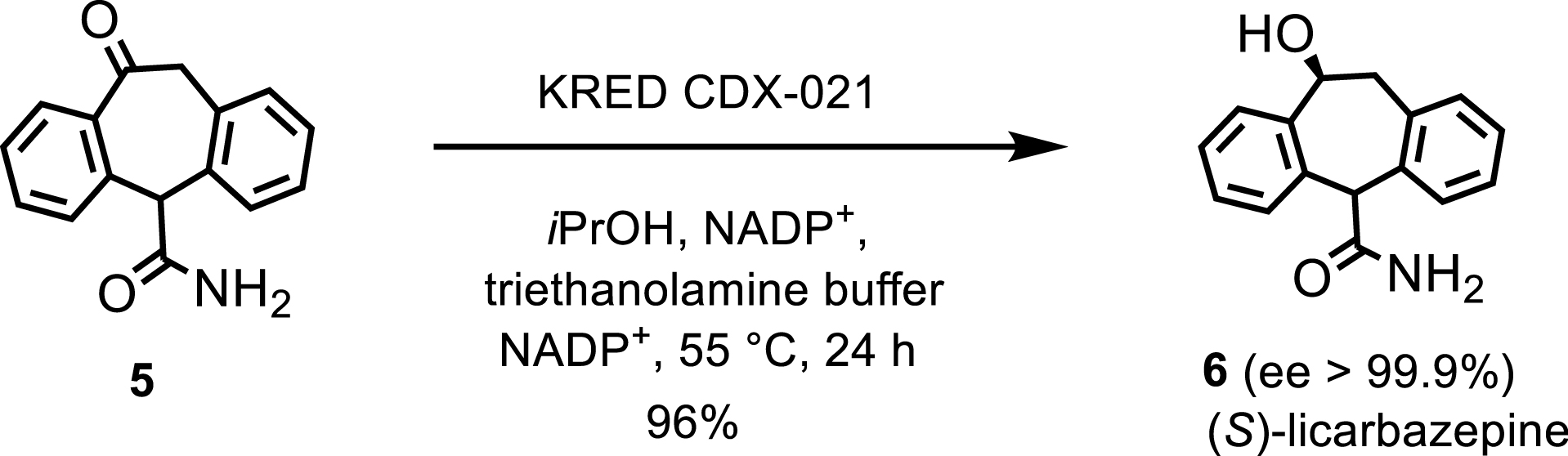Additionally, an engineered KRED facilitated the scalable synthesis of (S)-licarbazepine, an anticonvulsant [5]. After four rounds of engineering and a design of experiments (DoE) made up of 32 experiments, the process was conducted on a 500 mL scale, 50 g of ketone, and 1% w/w of KRED CDX-021. This produced (S)-licarbazepine 6 in 96% yield after distillation and filtration (Scheme 3). KRED CDX-021 recycled NADP+ by oxidizing propan-2-ol, with a nitrogen sweep removing acetone to drive the reaction forward.