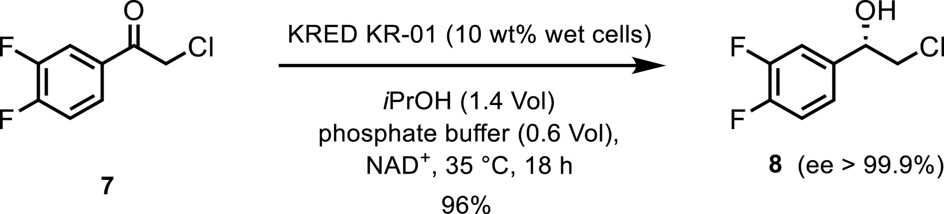 A wild-type KRED from Leifsonia sp. S749 was used to synthesize (S)-2-chloro-1-(3,4-difluorophenyl)ethanol 8, an intermediate for ticagrelor, a treatment for acute coronary syndromes [6]. The enzyme, overexpressed in recombinant E. coli, was used in concentrated conditions with propan-2-ol and phosphate buffer, recycling NAD+ by oxidizing isopropanol (Scheme 4). The reaction was optimized to substrate loadings of 500 g/L and resulted in space time yields of 145.8 mmol/L/h. The same enzyme also converted a different substrate, (R)-1-(3,5-bis(trifluoromethyl)-phenyl)ethanol, also at 500 g/L substrate loading with high yield and high stereoselectivity.