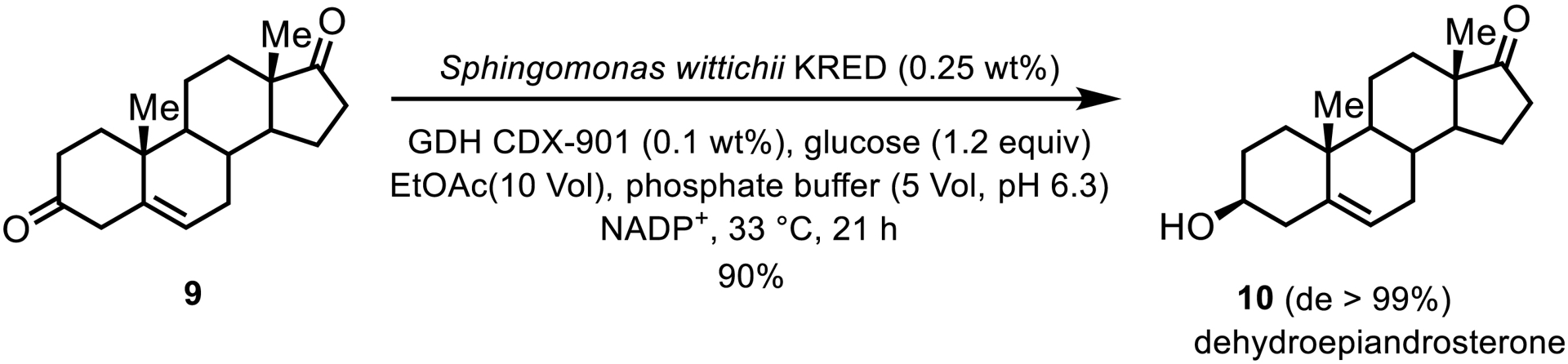 An example of a bulky substrate involved a wild-type KRED from Sphingomonas wittichii for the reduction of 5-androstene-3,17-dione 9 to dehydroepiandrosterone (DHEA) 10, a precursor for steroidal drugs (Scheme 5) [7]. This KRED was identified by a colorimetric screen in the reverse oxidative direction, to streamline the identification of enzymes which acted on the desired regio- and stereoisomer. The resulting highly stereo- and regioselective reaction produced DHEA with minimal by-products and up to 150 g/L substrate loadings under biphasic reaction conditions.