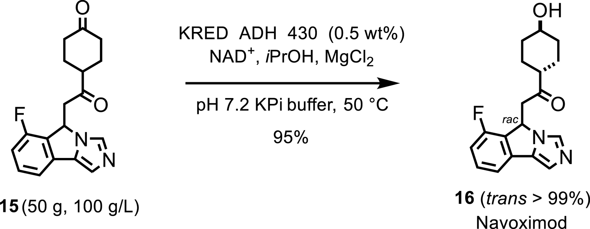 Another report from Roche detailed the synthesis of an intermediate for the indoleamine 2,3-dioxygenase inhibitor navoximod. Both ketone moieties of the diketone intermediate were initially targeted for biocatalytic reductions with a screen of 500 KREDs performed; however, a metal hydride reduction was ultimately favored for the central ketone. Their KRED panel was successfully screened resulting in a process scaled up to 50 g scale, achieving high yield and selectivity with low enzyme loading (Scheme 8) [10].