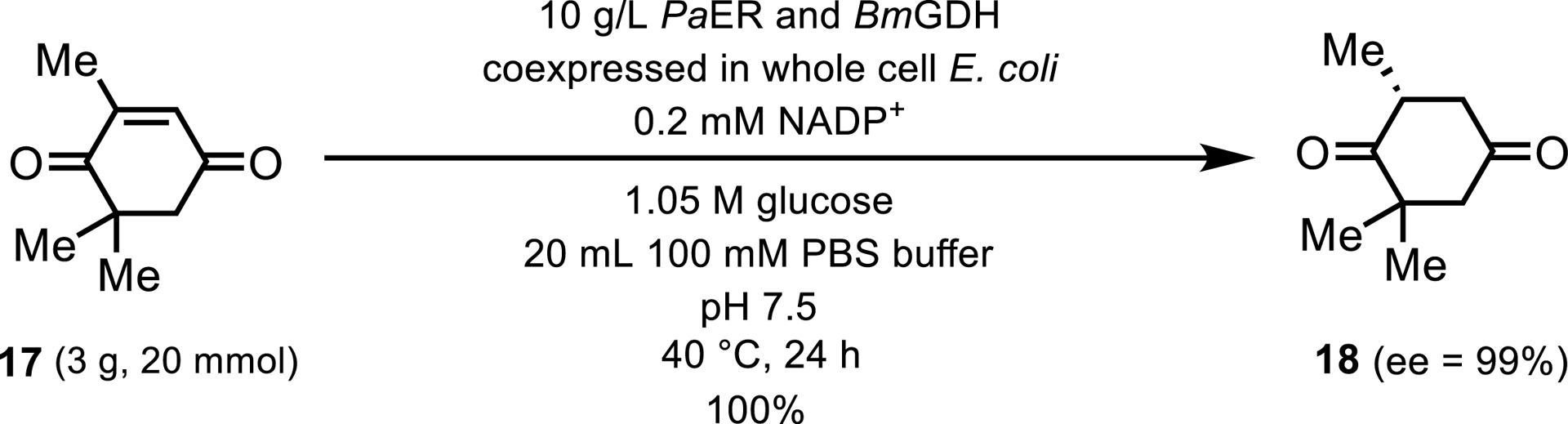 A recent scholarly article detailed the characterization of a novel ERED derived from Pichia angusta (PaER), which exhibited remarkable stereoselectivity in the reduction of ketoisophorone 17 to (R)-levodione 18 as depicted in Scheme 9 [17]. The reaction was conducted with an impressive substrate concentration of 154 g/L, utilizing whole E. coli cells that housed both the ERED and the GDH cofactor recycling enzyme.