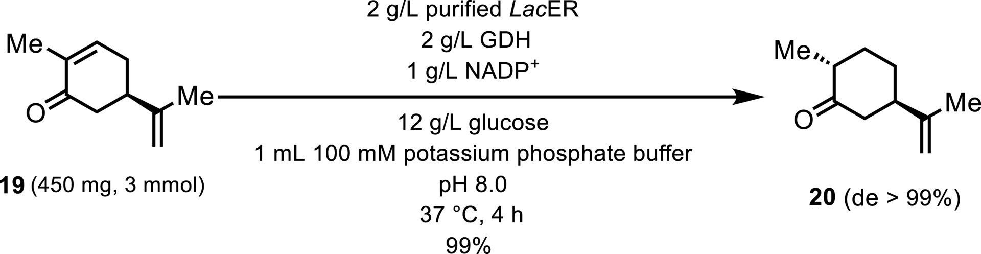 Another example characterized by almost perfect stereoselectivity involves an ERED isolated from Lactobacillus casei (LacER). This ene-reductase was used to catalyze the reduction of (5R)-carvone 19, yielding (2R, 5R)-dihydrocarvone 20 as illustrated in Scheme 10 [18]. The enzyme facilitated the production of this compound with a diastereomeric excess (de) of 99%. Additionally, this ERED demonstrated versatility by functioning in a one-pot cascade reaction alongside a KRED, culminating in the synthesis of (1S, 2R, 5R)-dihydrocarveol.