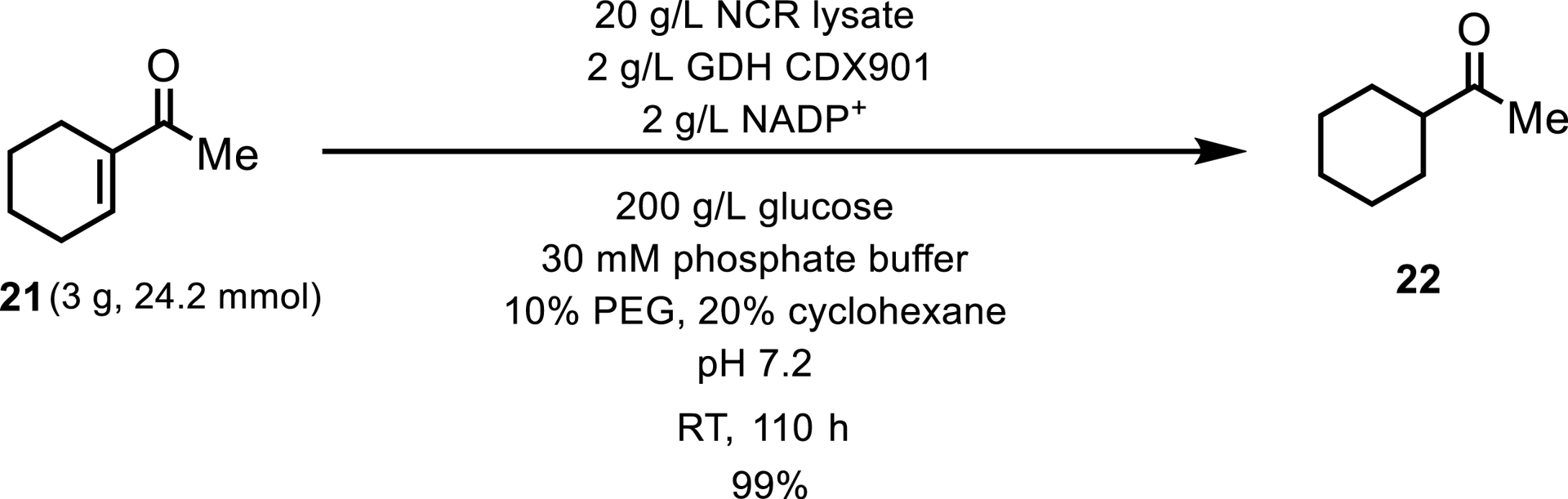 The NCR ERED has also been documented to function effectively at elevated substrate concentrations. For instance, a study focusing on the reduction of 1-(cyclohex-1-en-1-yl)ethan-1-one 21 to 1-cyclohexylethan-1-one 22 reported a substrate loading capacity of 100 g/L, achieving a 99% conversion over a span of 110 h (Scheme 11) [22].
