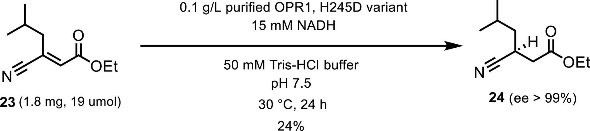 EREDs have been employed in the synthesis of pharmaceutical intermediates, notably in the production of pregabalin, a medication with anticonvulsant, analgesic, and anxiolytic properties for treating neurological conditions. Ethyl (E)-3-cyano-5-methylhex-2-enoate 23 underwent reduction by 12-oxophytodienoate reductase (OPR1) to yield ethyl (S)-3-cyano-5-methylhexanoate 24, as depicted in Scheme 12 [23].