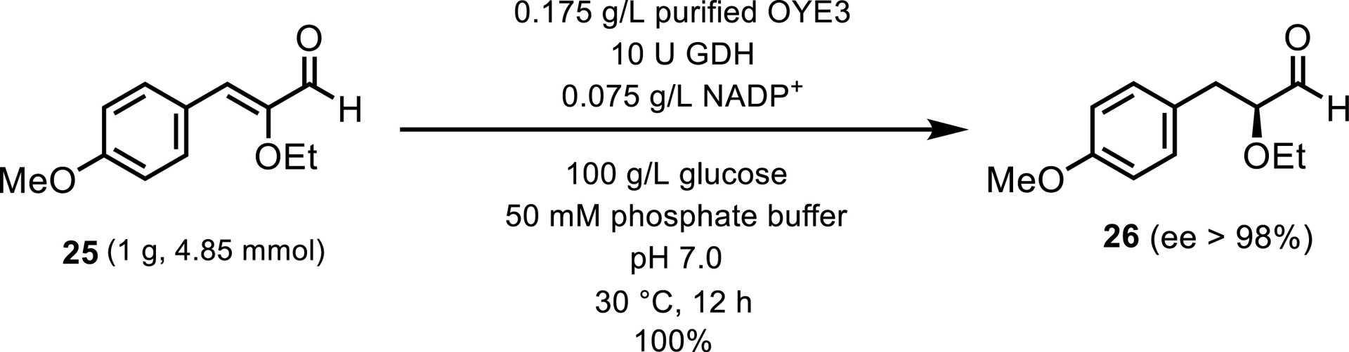 EREDs have also been utilized in the synthesis of intermediates for pharmaceuticals, exemplified by tesaglitazar, a drug under investigation for the treatment of type 2 diabetes [24]. The specific reaction involves the reduction of (Z)-2-ethoxy-3-(4-methoxyphenyl)acrylaldehyde 25 to (S)-2-ethoxy-3-(4-methoxyphenyl)propanoic acid 26, executed with high efficiency and selectivity (100% conversion; 98% ee), employing Old Yellow Enzyme 3 (OYE3) as the biocatalyst (Scheme 13).