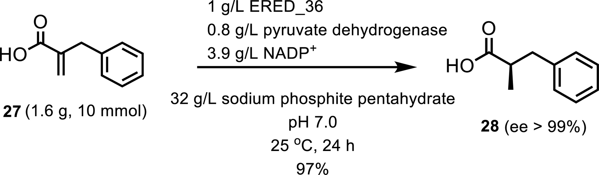 Ene-reductases have also been shown to catalyze reactions that are not limited only to activated olefins. Two recent reports have shown the expansion of the ERED substrate scope. The first report demonstrated that EREDs can reduce several carboxylic acid substrates [25], of which the most successful example involved the stereoselective reduction of 2-benzylacrylic acid 27 (Scheme 14).