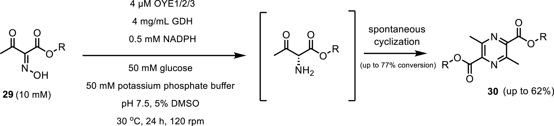 The second report showed a novel feature of EREDs, the reduction of C=N in oximes (Scheme 15) [26]. Several enzymes exhibited this activity with the most notable members being OYEs 1, 2 and 3. In addition, for seven out of the eight oxime substrates tested, EREDs have demonstrated catalysis characterized by an isolated yield greater than 50%, at 10 mM substrate loading.