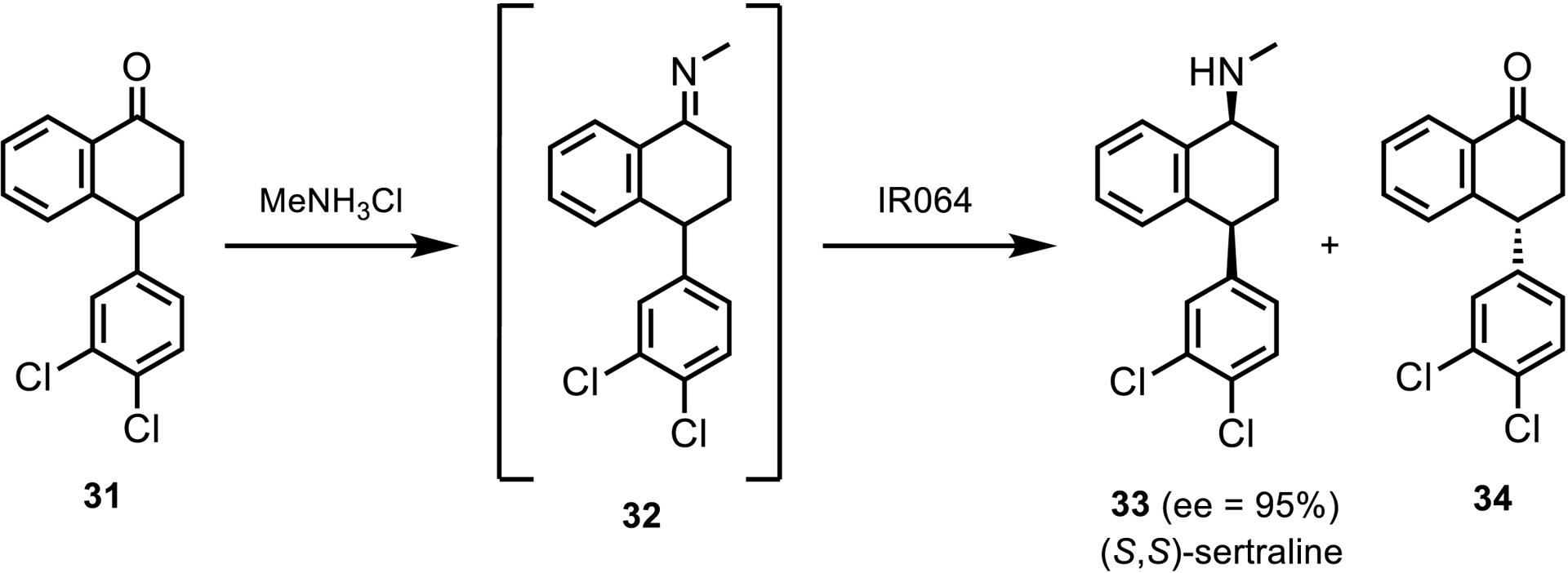 In 2017, Pfizer gave a brief report of an IRED-catalyzed reduction to synthesize (S,S)-sertraline [36]. Since the aryl ketimine 32 did not form spontaneously, the team synthesized the imine by chemical means and fed it into the IRED reduction. Via this route, IR064 from Myxococcus fulvus was identified as a hit for the reduction with the desired selectivity at both chiral centers and 95% ee (Scheme 16). Enzyme engineering efforts focused on IR064 allowed the team to identify variants with improved activity and selectivity. One variant with 5 mutations gave a 2.3-fold improvement in activity with 95% ee [36].