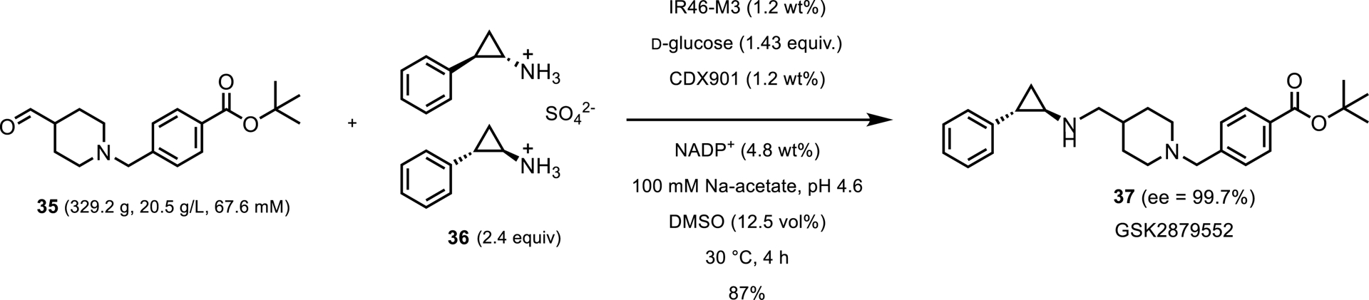 The first of these reports came in 2019 from GSK showing the use of an IRED from Saccharothrix espanaensis (IR-46) to resolve trans-phenylcyclopropylamine 35 and use it in the reductive amination of an aldehyde (Scheme 17) [39]. After three rounds of enzyme engineering, Schober and coworkers reported that they were able to run the reaction at 20.1 g/L aldehyde 35 with 1.2 wt% enzyme loading to reach 84% isolated yield of the desired product amine obtained with 99.7% ee. They noted that, although IREDs are typically most active at neutral to slightly basic pH, a slightly acidic pH was needed for product and substrate stability, and product solubility.