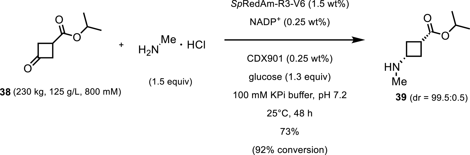 A few years later, Pfizer reported using an IRED from Streptomyces purpureus (SpRedAm) to couple isopropyl 3-ketocyclobutylcarboxylate 38 with methylamine for the production of an intermediate in the synthesis of abrocitinib [40]. The wild-type enzyme (40 wt%) was able to convert 20 g/L of ketone with 2 equiv of methylamine to give the desired product in 27% isolated yield. The engineered enzyme (SpRedAm-R3-V6) was used in this reaction at 230 kg scale with 125 g/L ketone and 1.5 wt% enzyme. Reaction performance under these conditions improved to 92% assay yield with 73% isolated yield and 99.5:0.5 dr (Scheme 18).