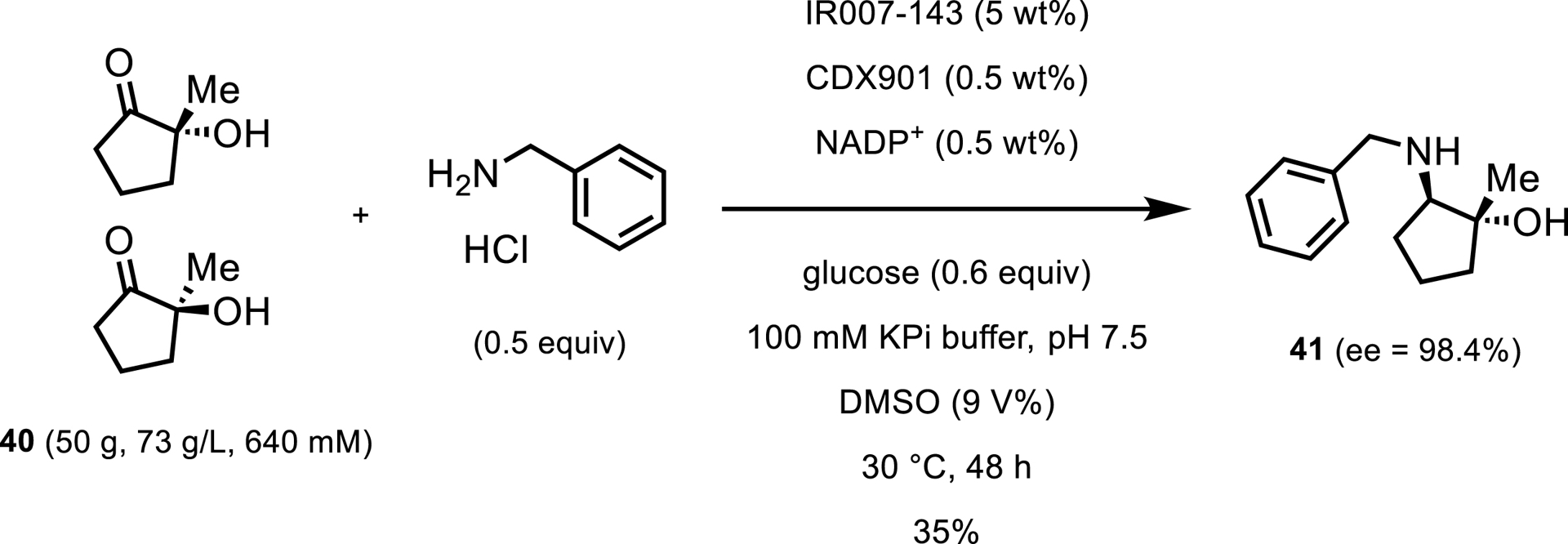 Another report from Pfizer showed the use of a larger amine in a resolution and reductive amination of hydroxyketone 40 [41]. As part of a synthesis toward an investigatory CDK2/4/6 inhibitor, the team identified an IRED from Amycolatopsis azurea, dubbed IR007, which resolved the racemic hydroxyketone via reductive amination with benzylamine as the donor to produce the desired amine as a single stereoisomer. After engineering IR007 for improved activity and stability, variant IR007-143 was identified, which resolved the ketone with only 2.5 wt% catalyst loading to give 35% isolated yield and 98.4% ee after 48 h (Scheme 19). This process was developed as an alternative to a transaminase-catalyzed reaction discussed in a later section of this review. With higher chiral purity and easier product isolation, this IRED approach was selected to move forward.