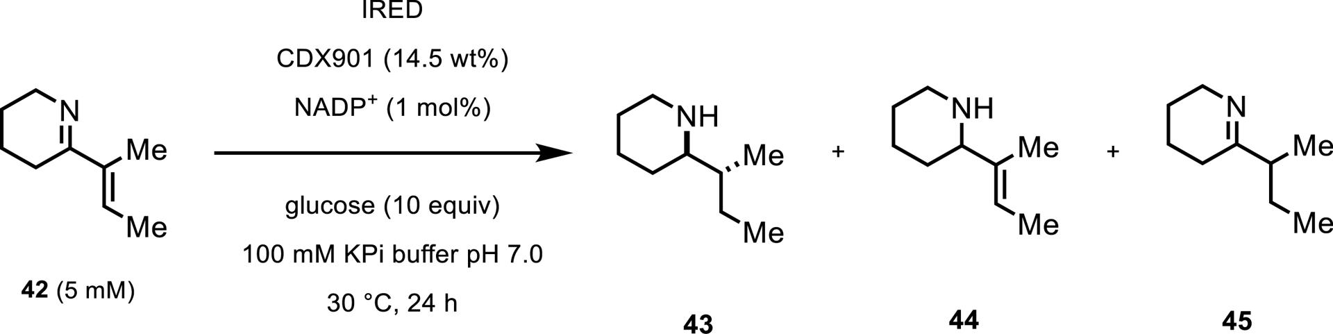 Most recently, Thorpe and coworkers have reported a new type of activity from IREDs. In 2022, the group showed the use of an IRED with α,β-unsaturated imines to reduce not only the C=N bond but also the C=C bond [42]. From a screen of 389 IREDs, 44 enzymes were identified which reduced the ene–imine to the fully saturated piperidine 43 (Scheme 20).