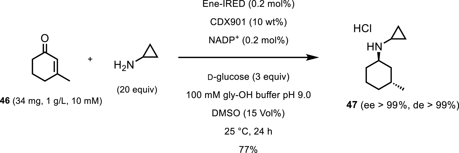 An additional 12 IREDs were identified that gave the reduction of only the C=C double bond resulting in 45. The enzyme with the highest activity for the full reduction was dubbed EneIRED and was selected for further study. After reaction optimization, EneIRED was able to catalyze the condensation and reduction of methylcyclohexenone 46 and cyclopropylamine to 61% conversion with only 1.1 equiv of amine (Scheme 21). When the reaction was performed with 20 equiv, the final product was isolated as the chlorhydrate salt in 69% yield. To test the scalability of the new reaction, the condensation/reduction of 3-methylcyclohex-2-en-1-one and cyclopropylamine was run at mmol scale with 50 mM enone and 5 equiv of amine. The desired product of this reaction was isolated in 77% yield.