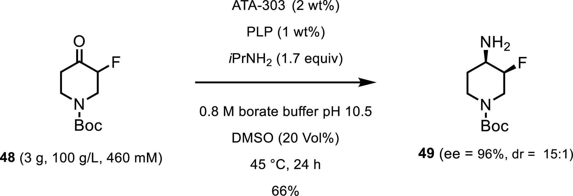 In 2019, the biocatalysis team at Merck reported the use of a transaminase for the synthesis of an intermediate for a CGRP receptor antagonist, 4-amino-N-Boc-3-fluoropiperidine 49 [43]. Starting from the racemic fluoroketone 48 and screening at pH 10.5 to promote epimerization of the chiral fluoride center, the team identified ATA-303 from Codexis as a hit for the desired product stereoisomer. Under initial screening conditions, the ATA-303 gave the desired isomer with 79% ee and 16:1 dr (Scheme 22). Without any enzyme engineering, the process was intensified to 100 g/L ketone and 2 wt% enzyme. This process resulted in 66% isolated yield, with 94% ee and 15:1 dr.
