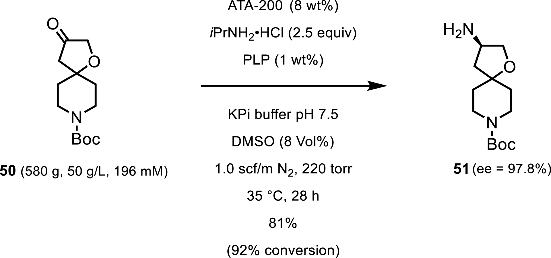 One obstacle commonly encountered with transaminases is the fact that these reactions are controlled by the reaction equilibrium and require a large excess of amine donor to push the reaction forward. Fortunately, several methods have been developed to introduce a thermodynamic or entropic driving force into the reaction. With isopropylamine as the amine donor, the reaction can be pushed to completion by removing the acetone by-product with a constant nitrogen sweep, or by applying a slight vacuum. A report from Pfizer in 2021 showed the use of another commercial transaminase (ATA-200) in the synthesis of 3-amino-4′-Boc-spiro[oxolane-2,4′-piperidine] 51 [44]. In this process, the spiroketone was converted to the amine using 2.5 equiv of IPA and applying a constant nitrogen sweep with periodic vacuum at 220 torr. As in the previous example, no enzyme engineering was needed, and the process was successfully implemented at 50 g/L ketone and 8 wt% enzyme. The optimized conditions resulted in the reaction where the desired amine was isolated with 82% yield and 98% ee (Scheme 23). Additionally, the enzymatic synthesis enabled the formation of 51 as a single enantiomer, avoiding the use of hazardous reagents such as bromine, sodium azide, and triphenylphosphine.