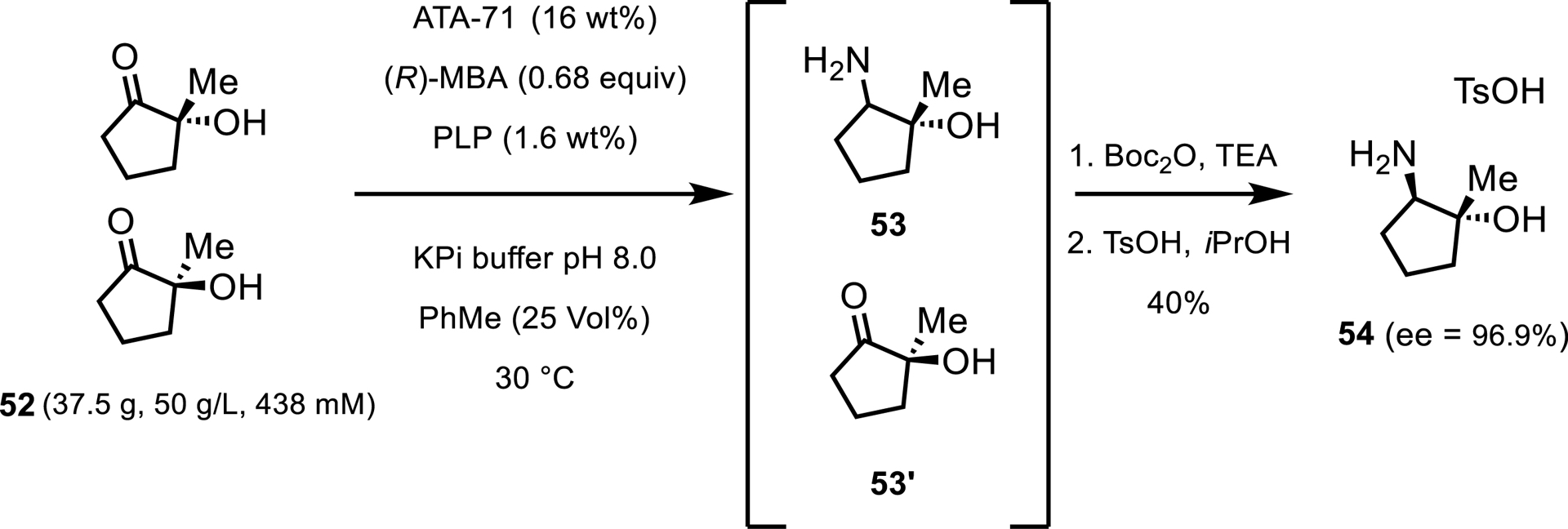 Alternatively, when methylbenzylamine (MBA) is used as the amine donor, evaporation of the by-product can be replaced by removal extraction. In 2022 [41], a report showcased this in a transamination/resolution of hydroxyketone 52 (Scheme 24). In this report, the authors explain that while isopropylamine was initially used for development, it led to an unfavorable reaction equilibrium causing the reaction to stall at low conversion. Applying the nitrogen sweep helped increase conversion but also caused significant solvent loss and deactivation of the enzyme. To remedy this, the team used (R)-MBA instead, as using this donor imparted a more favorable equilibrium. One caveat to this is that the formation of acetophenone can be detrimental to the enzyme at higher concentrations. To account for this phenomenon, the reaction was run as a biphasic mixture with 25 vol% toluene to remove the acetophenone as it is formed. These conditions allowed the reaction of 50 g/L ketone and 16 wt% enzyme load to reach 40% yield over 3 steps with a very favorable 97% ee.