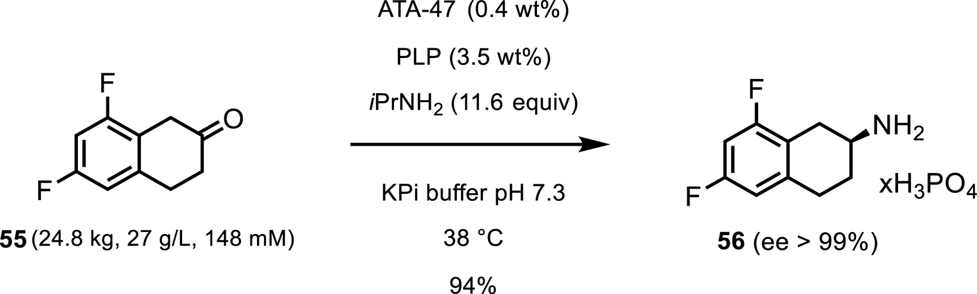 A less common method of driving the transaminase equilibrium forward is by removing the desired product from the reaction mixture as it is formed. A 2017 report showcases the synthesis of 2-amino-6,8-difluorotetralin 56 [45]. The Pfizer biocatalysis group showed that using ATA-47 from c-LEcta GmbH enabled the conversion of 6,8-difluoro-beta-tetralone 55 to the desired (S)-amine in 94% yield (Scheme 25). More importantly, they reported that due to low solubility of starting material and product, the product precipitated in the form of phosphoric acid salt as it was formed.
