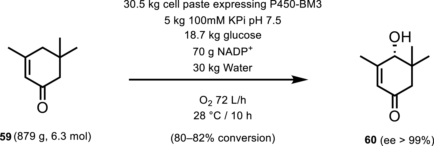 An example of P450-BM3 reaching a kilogram scale production was demonstrated by Kaluzna et al. [52] where they synthesized 4-hydroxy-α-isophorone 60 from α-isophorone 59. At a 1 L scale, Kaluzna et al. were able to obtain unprecedented product concentration of 10 g/L and a space time yield of 1.5 g/L/h (Scheme 27). Upon extensive reaction engineering, the process was scaled up to a 100 L scale, however the authors noted that at this scale, the reaction was restricted by the oxygen transfer rate (OTR) and by self-deactivation of the enzyme.