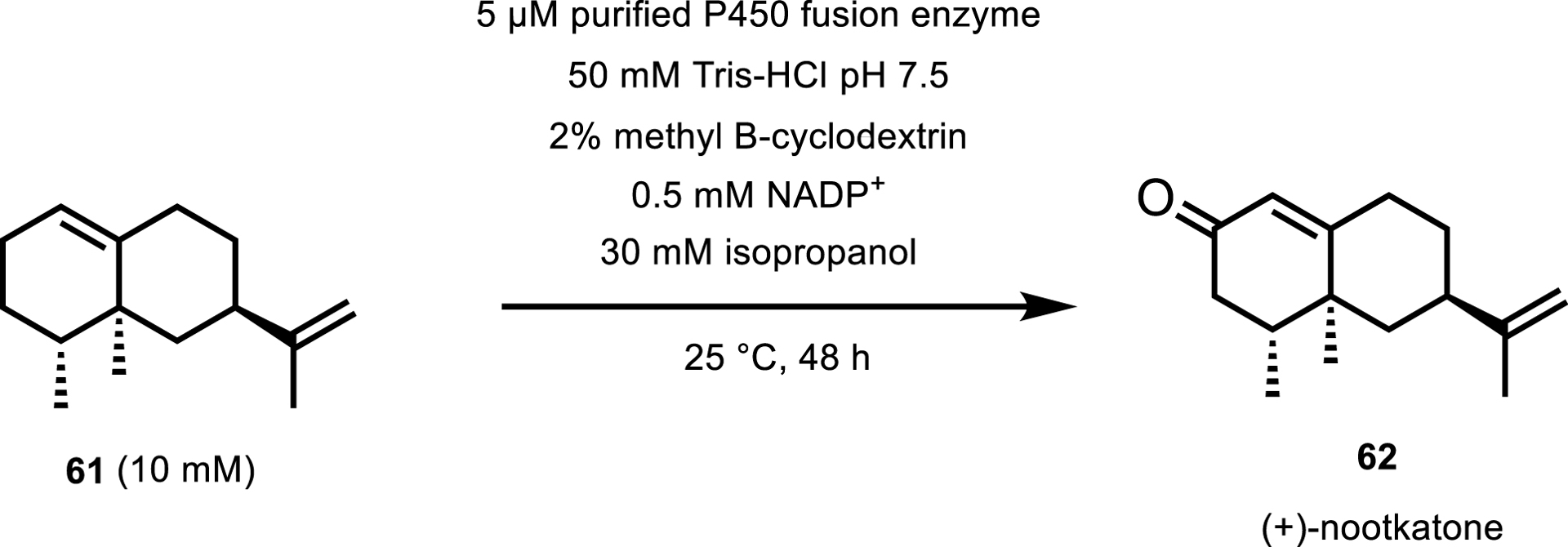 This has also been taken a step further, by Kokorin et al. [54], where a dehydrogenase enzyme has been fused to a self-sufficient P450 to eliminate the need for a separate cofactor recycling enzyme, resulting in an increase of activity and catalytic efficiency. Kokorin and Urlacher [55] then expanded on this work by applying a fusion enzyme to the two-step oxidation of the insecticide and food additive (+)-nootkatone 62 from (+)-valencene 61 with 1.5 times increase in activity compared to the individual enzymes (Scheme 28).