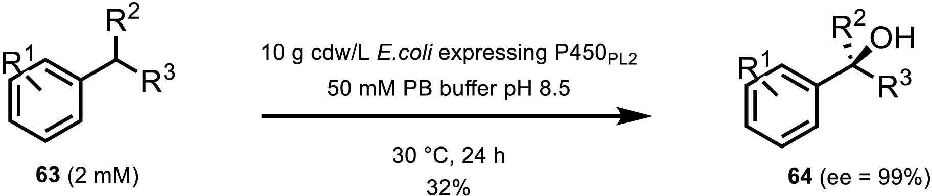 Although P450s are often considered to have narrow substrate scopes, Zhang et al. [56] have demonstrated that hydroxylation at a tertiary carbon position is possible with P450s. Tertiary hydroxylation is synthetically often difficult to achieve on inactivated C–H bonds and even more difficult to achieve in high enantiomeric excess. Zhang et al. engineered P450-BM3 variant P450PL2 to reach up to 99% ee and 32% yield upon α-hydroxylation of a benzylic C–H bond with a range of substituted substrates (Scheme 29).