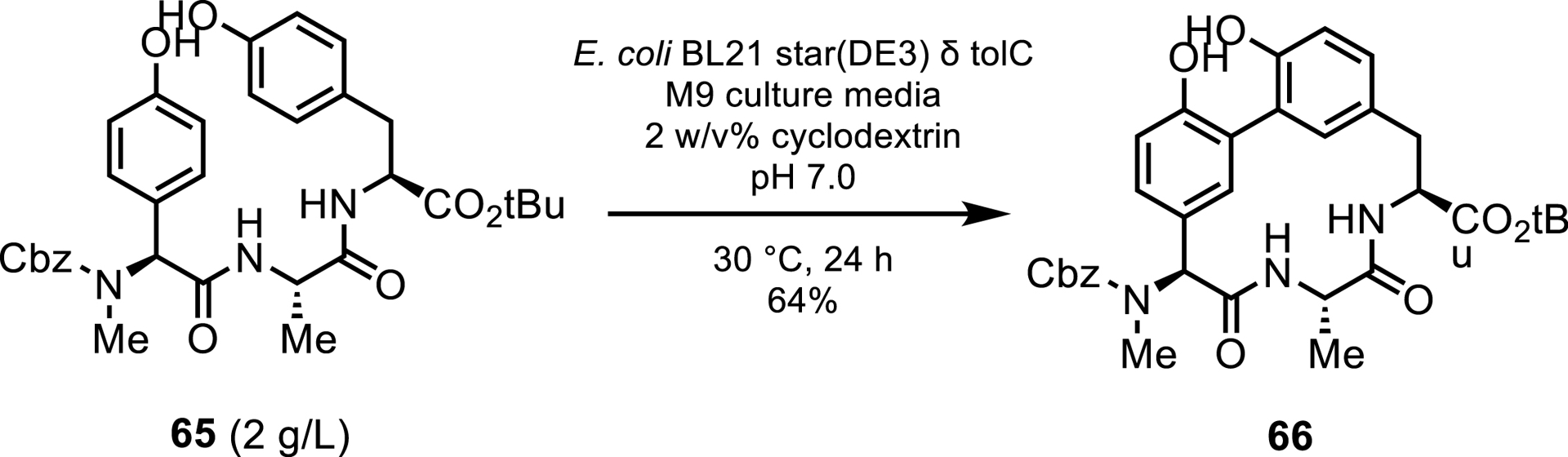 Aside from hydroxylations, alternative functionalizations by P450s are being explored on process scales. A recent report by Genentech has demonstrated that engineered P450s are a viable replacement for Suzuki–Miyaura couplings on a gram scale by performing an oxidative biaryl macrocyclization to produce an arylomycin antibiotic core 66. Molinaro et al. [57] obtained 1.3 g of product in 64% yield from a 3 L fermentation process after purification (Scheme 30).