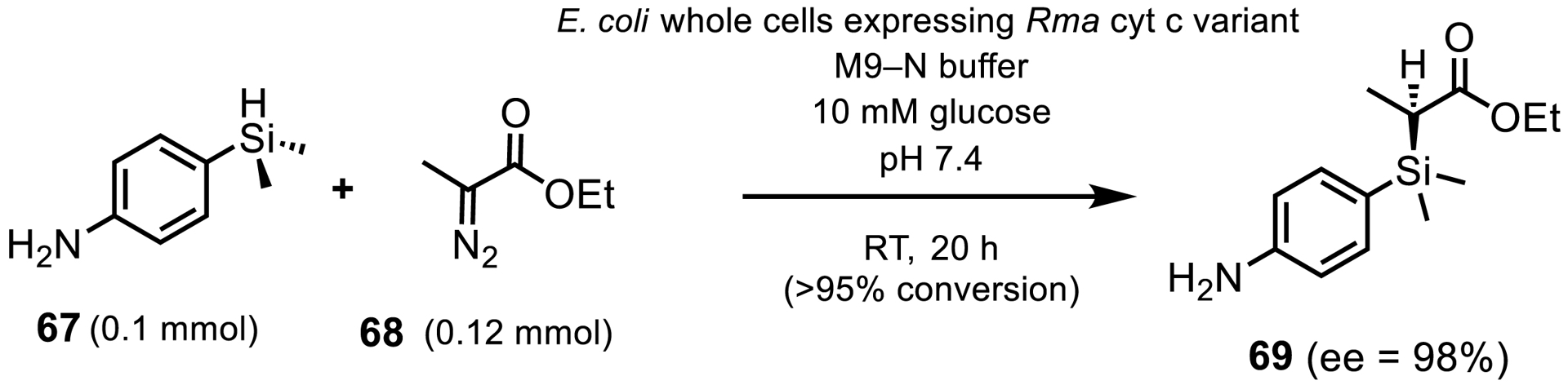 Bond connections that do not occur in natural biological processes have also been performed by P450s. Inspired by P450’s non-natural carbene transfers with N–H and S–H insertions to form C–N or C–S bonds [58, 59], Kan et al. [60] proposed that a similar method could be achieved with Si–H insertions to form carbon–silicon bonds. As C–Si bonds are present in a diversity of compounds which include materials and pharmaceutical compounds, upon engineering cytochrome c from Rhodothermus marinus (Rma cyt c), Kan et al. were able to stereoselectively insert a C–Si bond into 4-(dimethylsilyl)aniline 67. Moreover, Rma cyt c was engineered to chemoselectively form the C–Si bond despite the presence of a competing nitrogen atom in the molecule. Preparative-scale reactions with whole cells resulted in over 95% conversion and a 70% isolated yield with 98% ee and a total turnover number (TTN) of 3410 (Scheme 31).