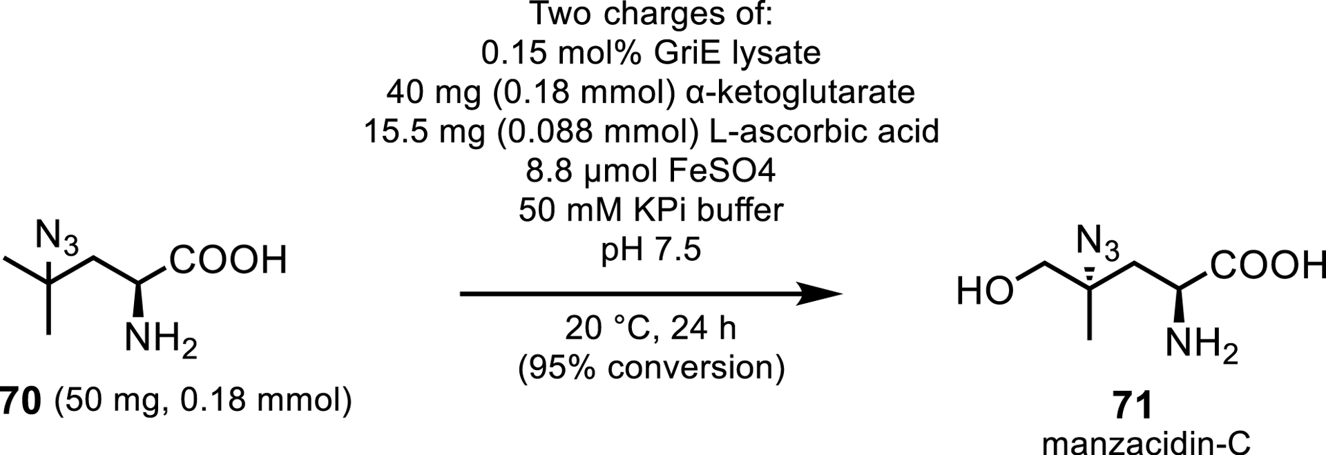 One such enzyme, is the putative leucine hydroxylase GriE, which performs sequential oxidations at the delta position of L-leucine, forming 4-methylproline by cyclization via a spontaneous reductive amination in the biosynthesis of griselimycin [63]. Zwick and Renata [64, 65], report a proof of concept where they employ GriE as the first Fe/αKG to be used in a natural product synthesis. They share that GriE can produce an array of substituted pyrrolidine building blocks and also demonstrate the utility of the enzymes in natural product synthesis by performing the chemoenzymatic preparation of manzacidin-C (Scheme 32), a bromopyrrole alkaloid first isolated from sea sponge Hymeniacidon sp. [66] Zwick and Renata reported a photocatalytic azidation to L-leucine which is followed by a single Δ hydroxylation by GriE, creating the hydroxylated product intermediate with a yield of 95% on a 130 mg scale.