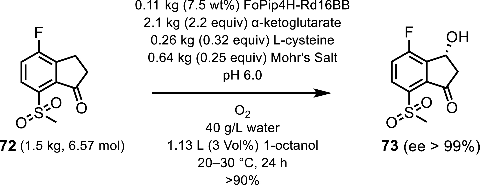 Most recently, the industrial potential of Fe/αKG hydroxylases has been used by scientists at Merck who have incorporated an Fe/αKG into the synthesis of the oncology treatment belzutifan, by performing a stereoselective hydroxylation on a non-native fluoroindanone intermediate 72 [67, 68, 69]. This biocatalytic step replaced five chemical synthesis steps reducing the process mass intensity (PMI) by 43%, again illustrating the environmental advantages to employing biocatalysts in industry. Cheung-Lee et al. [67] reported that, despite a P450 reaching higher conversions in their initial screens, a Fe/αKG hydroxylase, FoPip4H from Fusarium oxysporum, was selected for further development in this process due to the resulting economic and time benefits. After 15 rounds of directed evolution, FoPip4H Rd16BB showed a 3000-fold improvement in catalytic efficiency over the wild type. Furthermore, DiRocco et al. [68] stated that an overall improvement of more than 400,000-fold was observed in comparison to the wild type when enzyme loading, reaction concentration, yield, and enantioselectivity were achieved. At kilogram scale, the final variant exhibited yields and ee of more than 90% and than 99%, respectively (Scheme 33).