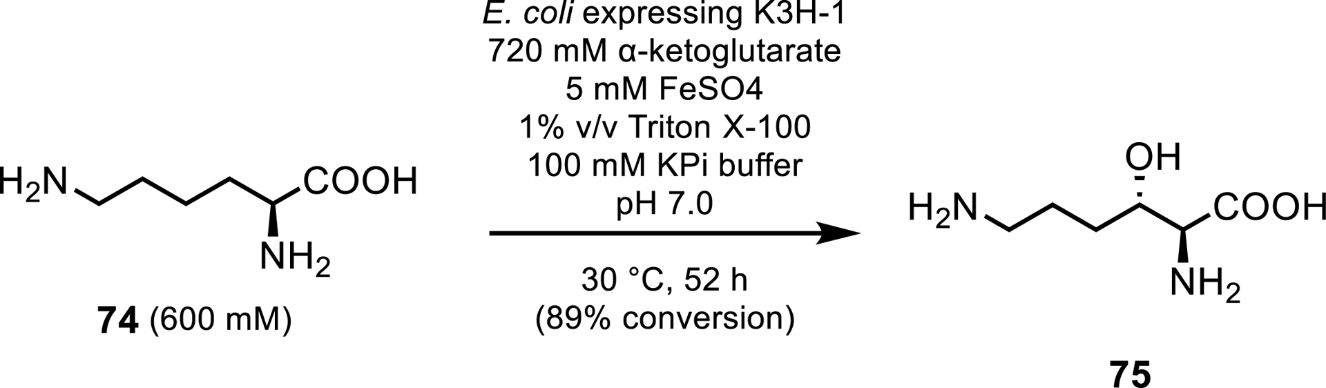 Another scaled up application of Fe/αKGs was demonstrated by Hara et al. [70]. They reported the preparative-scale synthesis of (2S,3S)-3-hydroxylysine 75, among other hydroxylysines, which can be an intermediate in the synthesis of (−)-balanol, a protein kinase C inhibitor. The lysine hydroxylases tested in this study were identified by sequence analysis of the clavaminic acid synthase superfamily with K3H-1 showing the greatest productivity. High substrate loadings were achieved of up to 600 mM lysine, and after 52 h, a 40 mL reaction yielded 531 mM (86.1 g/L) of (2S,3S)-3-hydroxylysine, with 89% molar conversion from whole cells expressing K3H-1 (Scheme 34). The authors did not report the diastereoselectivity of the enzyme.