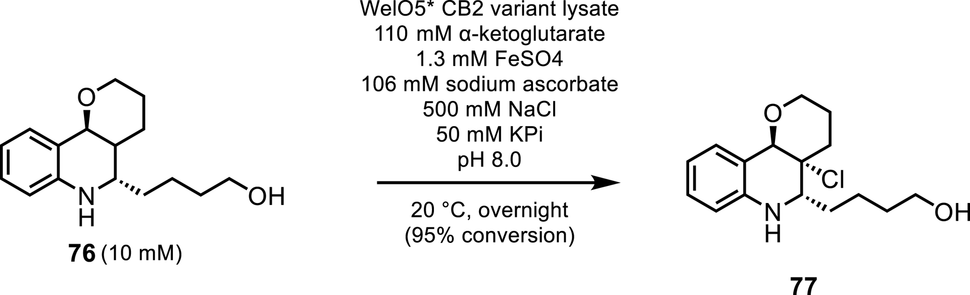 Aside from hydroxylations, halogenations with Fe/αKG enzymes are being reported more frequently in the literature. In 2005 the first Fe/αKG halogenase, SyrB2, was discovered to perform monochlorination of a L-threonine substrate covalently tethered to carrier protein, SyrB1 [71]. The requirement of a carrier protein limited the biocatalytic applicability of these enzymes. However, in 2014, WelO5, isolated from Fischerella ambigua and Hapalosiphon welwitschia, was identified as the first Fe/αKG halogenase to work on a freestanding small molecule. WelO5 performed a stereoselective monochlorination of an aliphatic carbon in the native substrates 12-epi-fischerindole U and 12-epi-hapalindole C [72], and has subsequently been engineered for biocatalytic applications. Mutagenesis studies on these halogenases were performed by Novartis and the Buller team in Switzerland [73, 74], using a homolog of WelO5 called WelO5∗ with 95% sequence identity from Hapalosiphon welwitschia. This was the first study to evolve a Fe/αKG halogenase for a substrate other than the native indole-alkaloids. Hayashi et al. were able to evolve WelO5∗ to halogenate fragments of a substrate analog of martinelline 76, a bradykinin receptor agonist. After two rounds of mutagenesis, the final variant was able to perform both chlorination and bromination to the martinelline core analog reaching 95% conversion at 10 mM substrate loadings (Scheme 35). It was noted that this mutant reduced the formation of unwanted side products, exhibiting 290- and 400-fold increases in TTN and catalytic efficiency, respectively, over the wild-type enzyme. No diastereoselectivity of the catalyst was reported in the work of Hayashi et al.