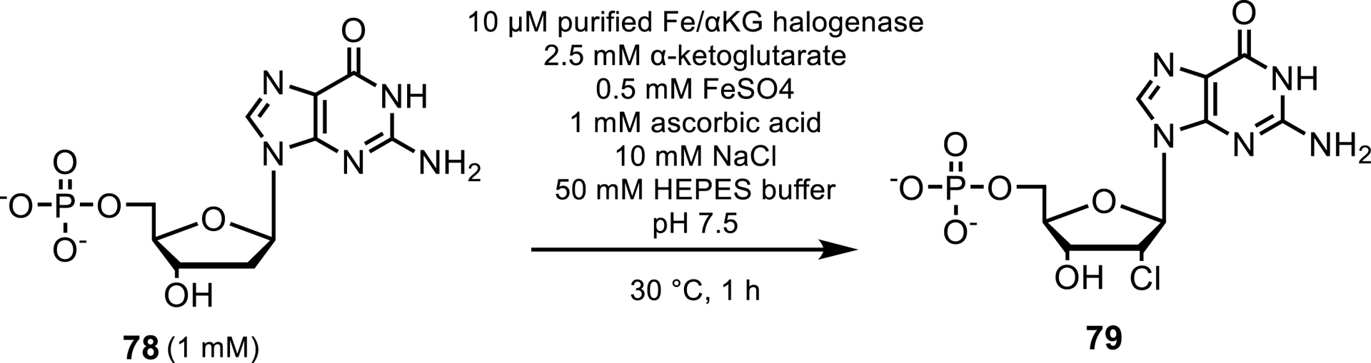 The Fe/αKG halogenases act on natural products. However, Fe/αKG amino acid halogenases and Fe/αKG nucleotide halogenases have also recently been discovered. BesD catalyzes the chlorination, bromination and azidation of aliphatic carbons in amino acids [75]. In 2020, an Fe/αKG nucleotide halogenase called AdeV was the first Fe/αKG to perform halogenations of nucleotides by carrying out a C2′-chlorination to 2′-deoxyadenosine-5′-monophosphate (dAMP) 78 (Scheme 36) [76]. Despite the narrow substrate scope of AdeV, these nucleotide halogenases have the potential to catalyze the halogenation of nucleotide analogs for therapeutic purposes such as anticancer medicine like clofaribine or antiviral drugs such as uprifosbuvir. Recent developments in nucleotide halogenases have been made by Ni et al. [77] who have identified enzymes VaNTH and CtNTH which can carry out chlorinations, brominations and azidations at the C2′ position of 2′-deoxyguanosine monophosphate (dGMP) and exhibit a more than 43-fold improvement in catalytic efficiency when compared with AdeV acting on dAMP. Furthermore Ni et al. demonstrated that the activity and nucleotide specificity can be modulated with engineering, demonstrating the potential that these enzymes hold for nucleotide modifications.