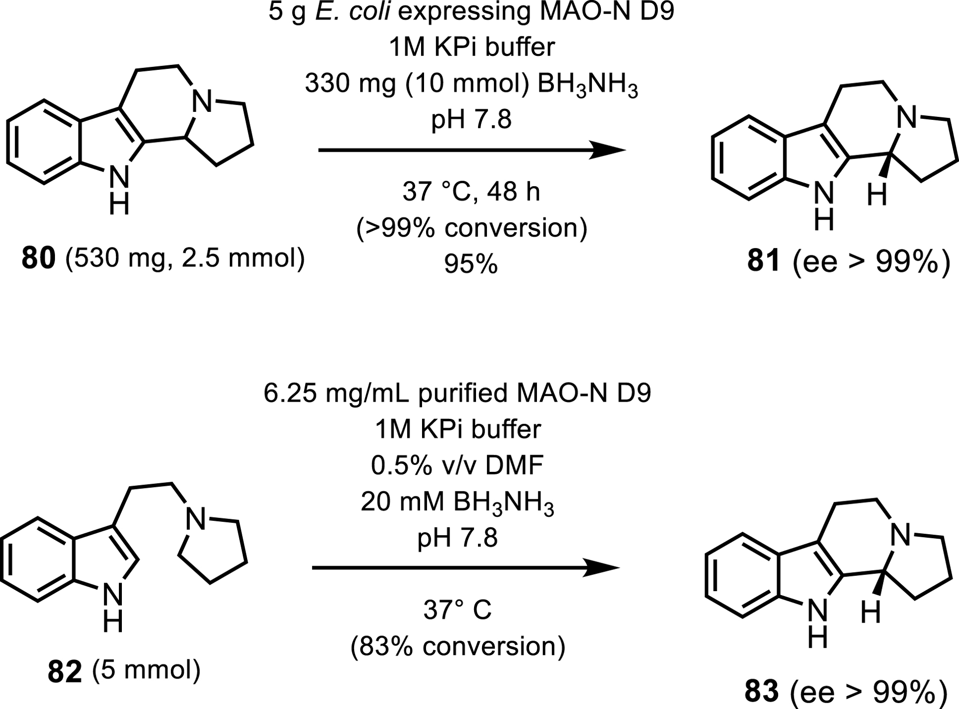 The pharmaceutical applicability of these MAO-N variants was demonstrated by the analytical-scale syntheses of solifenacin and levocetirizine. Their utility outside of deracemizations was also demonstrated by two approaches with the MAO-N D9 variant via the synthesis of (R)-harmicine 81, an alkaloid which shows anti-leishmania activity [79]. The first approach to synthesizing this active pharmaceutical ingredient (API) involved a deracemization step to afford the final product in more than 99% ee and 95% yield. The second approach reduced the overall syntheses to two synthetic steps by using an oxidative asymmetric Pictet–Spengler reaction resulting in more than 99% ee and 83% conversion (Scheme 37).