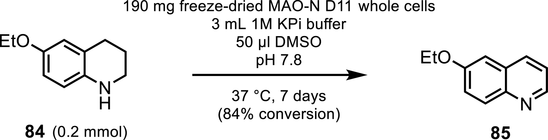 Recently, it has been demonstrated that MAOs can oxidize 1,2,3,4-tetrahydroquinolines (THQs) into quinolines and 2-quinolones [80] which are prevalent scaffolds in many APIs. Biotransformations were successful with unsubstituted or electron-donating substituents to THQ, with the ethoxy-substituted THQ affording 84% conversion (Scheme 38). However, bulkier or electron-withdrawing substituents performed poorly. In-silico studies did note that steric and binding constraints may be hindering the activity with bulkier substituted substrates. To overcome this, Xiang et al. also employed a horseradish peroxidase.