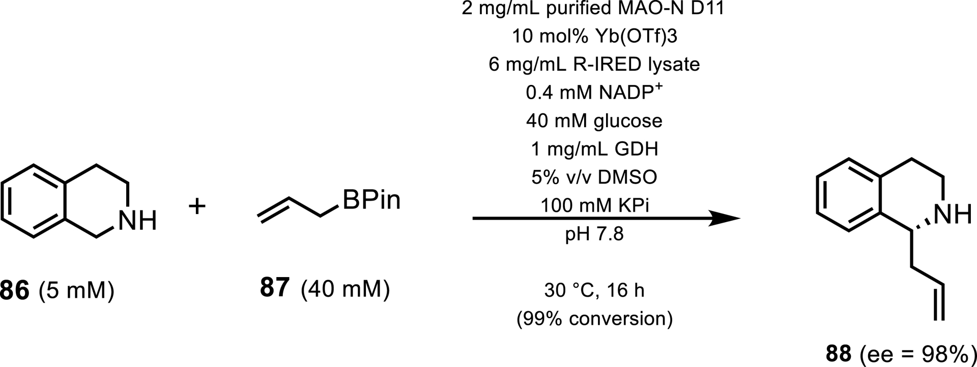 This focus on THQ-like molecules was taken even further by the Turner group. They introduced a chemoenzymatic cascade where they employed MAO-N and R-IRED enzymes alongside a chemical allylation resulting in C–C bond formation at the C1 position of tetrathydroisoquinoline (THIQ) 86 [81]. Sangster et al. noted that there have been few reports of enantioselective allylation of cyclic imines despite their prevalence in many pharmaceutical scaffolds. Here they demonstrated that the scaffolds can be synthesized on a preparative scale at high enantioselectivity of up to 98% ee and purified yields of 64% (Scheme 39). Furthermore, on analytical scales, a range of substituents both on the aryl ring and boryl–allyl partner were accepted with good conversions, albeit lower ee values, demonstrating the broad substrate scope that can be reached by this cascade.