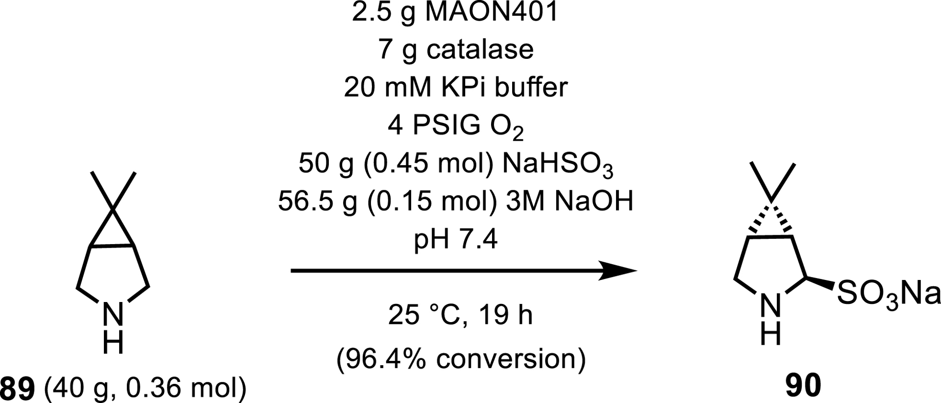 However, MAOs have not only been used to synthesize APIs on an analytical scale. Merck and Codexis employed a MAO for the synthesis of protease inhibitor boceprevir, used in the treatment of chronic hepatitis C infections [82]. MAO-N was evolved through 4 engineering rounds into MAON401, which replaced a synthetic resolution step in the synthesis of the P2 moiety of boceprevir 90. By replacing this synthetic step, Merck increased the product yield by 150% and reduced overall process waste (E-factor) by 63.1%, demonstrating the environmental advantages of employing biocatalytic steps in industrial processes (Scheme 40). The stereoselectivity of this MAO-N-catalyzed step was not reported.