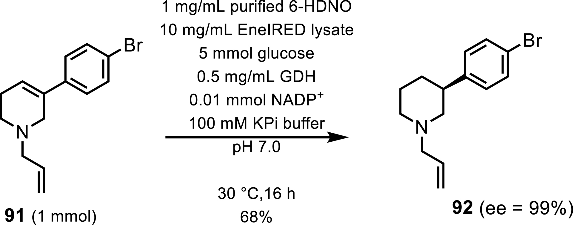 Aside from MAO-N, other S-selective FAD-dependent monoamine oxidases have been identified including human monoamine oxidases MAO-A [83], MAO-B [84], and cyclohexylamine oxidase from Brevibacterium oxydans [85, 86]. Only one R-selective MAO is reported in the literature by Heath et al. [87] 6-hydroxy-D-nicotine oxidase (6-HDNO) has been shown to isolate secondary and tertiary S-amines upon enzyme engineering. 6-HDNO has been included in cascades alongside IREDS [88]. Such a cascade reported by Harawa et al. [89] employs 6-HDNO and an EneIRED for the synthesis of 3-substituted and 3,4-disubstituted piperidines as intermediates in the synthesis of ovarian cancer drug Niraparib. 6-HDNO oxidizes a tetrahydropyridinium (THP) to form a dihydropyridinium (DHP) which is then enantioselectively reduced by an EneIRED to form the 3-substituted piperidine, which was obtained in 68% yield (Scheme 41).