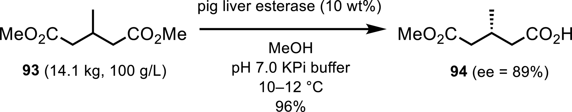 A biocatalytic desymmetrization was employed in the synthesis of the chiral lactam motif of the CGRP receptor antagonist (VIII). Researchers at Merck developed an esterase-catalyzed hydrolysis of the symmetrical diester 93 to achieve the chiral monoacid 94 in high yield (96%) (Scheme 42) [43]. Commercially available pig liver esterase was used for this transformation which was successfully scaled to multikilogram scale at high substrate loading (100 g/L). Only a modest ee of 89% was obtained from this enzymatic process, which could however be efficiently increased to 99% by a chiral salt resolution in a subsequent synthetic step.