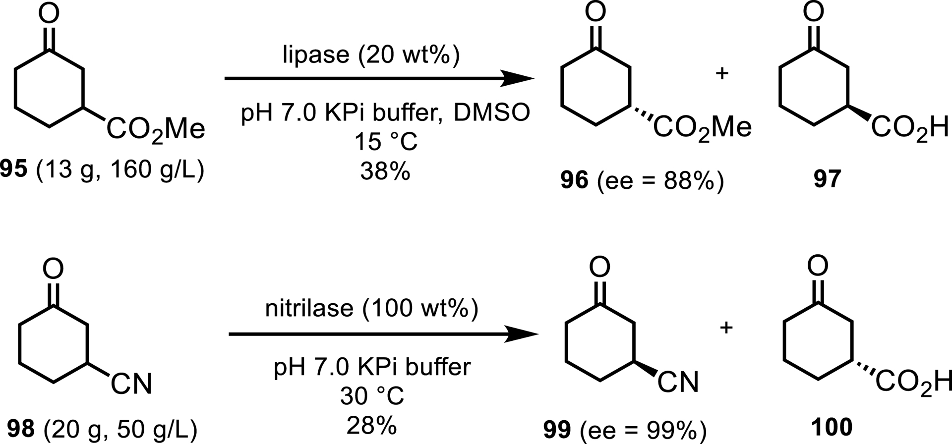 Researchers at GSK developed hydrolase resolutions to the enantiocomplementary compounds 97 and 100 (Scheme 43) [92]. A commercial lipase and a wild-type nitrilase were selected from screening for rapid process enablement to deliver multigram quantities of each material.