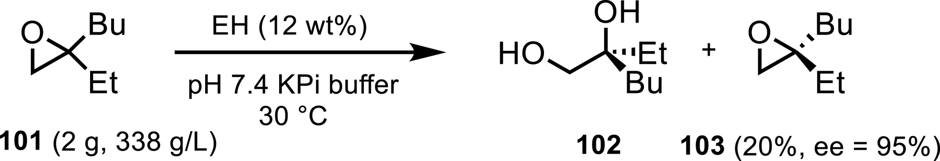 An epoxide hydrolase (EH) process was developed by GSK to resolve racemic epoxide 101, a key intermediate used to access the ileal bile acid transport (iBAT) inhibitor GSK2330672 (XVII) for type 2 diabetes and cholestatic pruritus (Scheme 44) [93]. The wild-type enzyme used for this reaction was identified from a panel comprised of literature and metagenomically sourced biocatalysts. This enzyme had sufficient activity and substrate tolerance to enable a 22 g scale-up with very high substrate loading (338 g/L). It was noted that enzyme engineering may be able to improve the selectivity of the enzyme to increase the yield of 103 while maintaining high enantioselectivity.