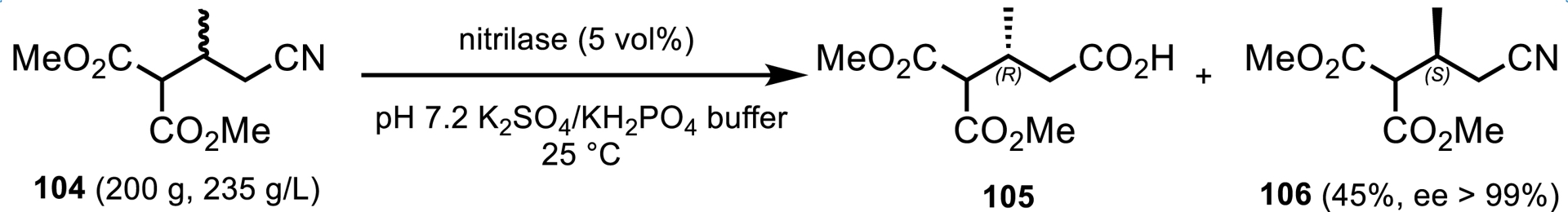 Genentech and Roche utilized a nitrilase to access an enantiopure nitrile building block for ipatasertib (Scheme 45) [94]. As part of their efforts to develop a long-term manufacturing synthesis of this API, a nitrile resolution process was developed in which the (R)-enantiomer of racemic nitrile 104 was selectively hydrolyzed to the corresponding acid 105, leaving the desired (S)-enantiomer 106 unreacted. A commercial enzyme from c-LEcta GmbH was employed in this transformation as a liquid preparation. It was found that high concentrations of sulfate and phosphate ions enhanced the enzyme activity and polar organic cosolvents had a detrimental effect on the enzyme performance. This led to a process being implemented on 200 g scale at very high substrate loading (235 g/L) without organic cosolvents (Scheme 45).