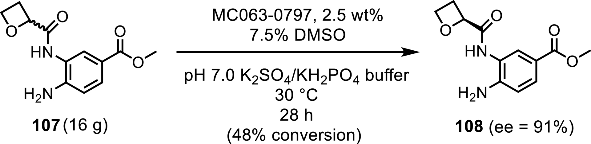 Another example of a successfully implemented hydrolase into a biocatalytic process involved an engineered variant of MC064, MC064-0797. This hydrolase was responsible for resolving a key racemic amide 107 in the synthetic process of an oral late-stage glucagon-like peptide-1 receptor agonist (GLP-1-RA) used in the treatment of type 2 diabetes mellitus (T2DM) and for weight loss [95, 96]. Two rounds of enzyme engineering improved the wild-type enzyme to support a 16 g reaction at low enzyme loads of 2.5 wt% (Scheme 46). The reaction yielded a close to perfect resolution of 48% conversion and 108 with an ee of 91%. The ee of the resulting product could be improved by using a chiral salt crystallization as a subsequent step.